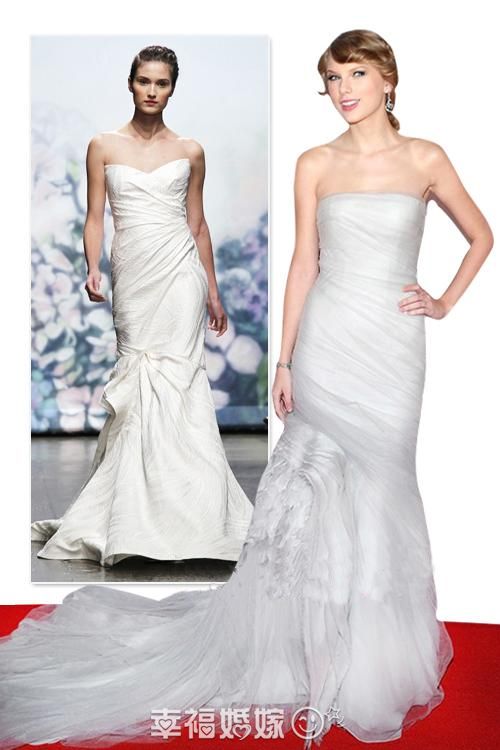 ??? 2011年度美國鄉村音樂協會獎 (CMA Awards) 頒獎典禮紅毯上,泰勒·史薇芙特 (Taylor Swift) 憑借一款白色J. Mendel禮服完美勝出,宛若出塵仙子般的氣質,對于婚紗禮服造型也很有啟發意義哦,裹身半魚尾+不對稱褶皺裙擺,把性感和飄逸感融為一體,放大高挑身材新娘的身材優勢