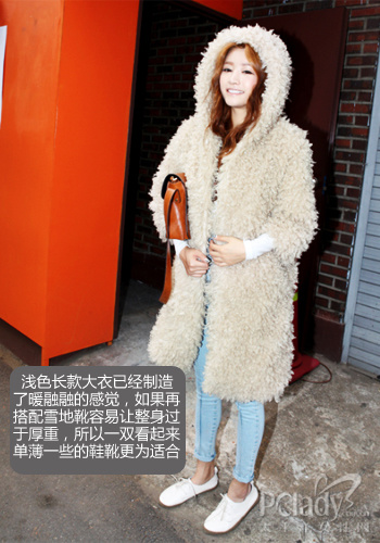 今冬毛絨絨的外套不知道有多走俏!不再一味的走俏“貂”毛線路,羊毛卷、鴕鳥毛元素憑借可愛清純的賣相,超好的手感贏得不少時尚MM們心動。喜愛之余的猶豫莫非身材問題,切忌!不要穿得像只熊哦!