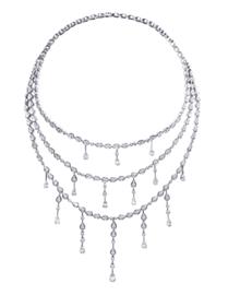 ??? 而一款宛若星空聚集的鉆石項鏈將橄欖形切割鉆石以層疊鑲嵌的方式打造具有縱深立體感的作品。(張雨)