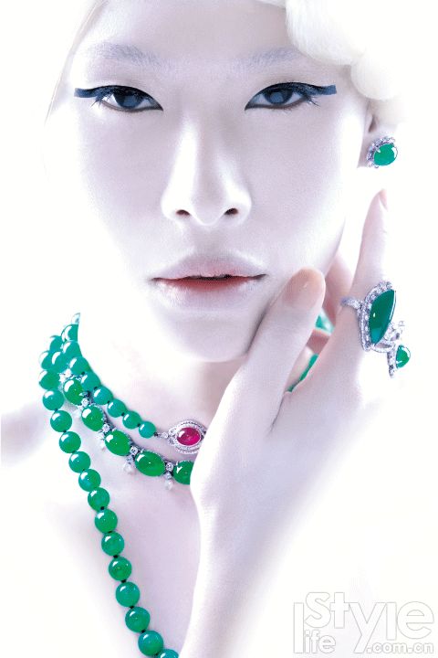 模特展示珠寶(從上至下):翡翠項鏈/RICH JADE 翡翠項鏈/ 七彩云南 翡翠戒指/ 七彩云南 翡翠戒指/RICH JADE
