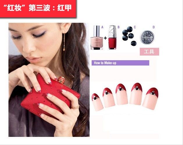 step1、先用肉粉甲油涂滿十指,待干以后在指尖前端涂上紅色甲油。