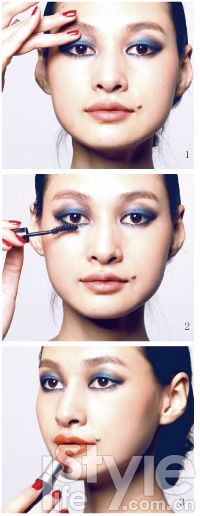 3.想要沖撞藍色,嘴唇就用橘黃色來呼應,這種像極了波普畫作的唇膏顏色,是用橘紅色唇膏打底,再用明黃色唇膏加重出來的,如果手邊沒有明黃色唇膏,黃色的眼影也可以點在唇上,一樣出彩
