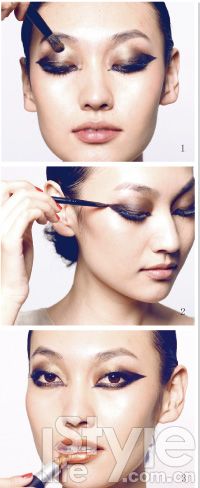 2.用深棕色眼影代替眼線,放大戲劇感,你可以畫出比平時粗3倍的眼線,眼尾的走向就像燕子的尾巴形狀,這樣的眼線會有幾分歌劇魅影的氣勢。