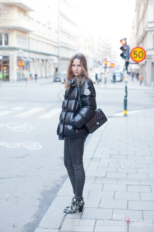 1. 黑色羽絨服也許是街頭最最常見的御寒工具了,如果想要穿出明星味兒,那就得準備一款精致的單肩包,搭配深色緊身褲,而腳下可以選擇一雙裝飾性強的高跟鞋,比如這位達人腳下的亮片高跟鞋,讓整個造型多了幾分前衛感