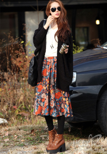 白色小V領打底內扎在橘色花裙中,露出的鎖骨展示自己的小性感,黑色毛毛外套長度適中,即有小女人的穩重也不會壓掉裙子帶來的甜美活潑感。