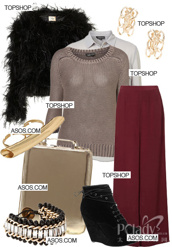 粉色必然是約會最佳選擇,條紋拼色的毛衣里面搭配了裸色復古圓領襯衫,搭配上灰色短裙,包包頭的發型襯托下可愛度馬上提升,皮草裝飾的短靴和襯衫呼應,鏈條包包斜跨也是很不錯的搭配。