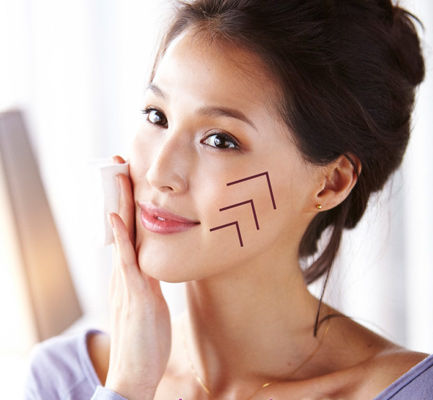 將化妝棉沾濕,動作放慢,沿著臉部輪廓線由下而上拍打,以全臉拍100下為目標:兩頰、額頭、鼻子各25下。