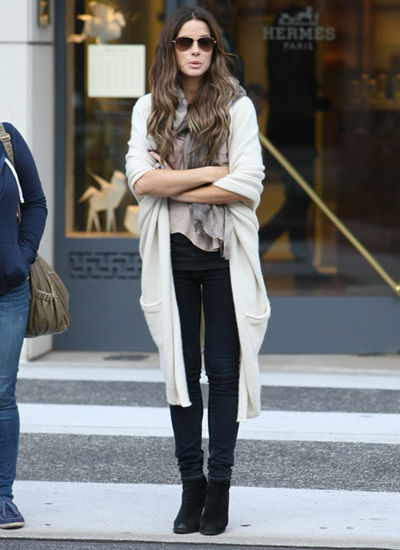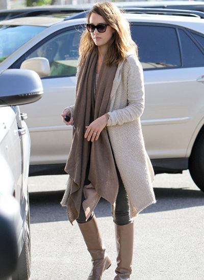 同是長款毛衣外套,下擺不規(guī)則,長長的圍巾置于胸前,下擺與外套有著異曲同工之妙,下半身為小腳褲+高筒靴,冬日顯瘦經(jīng)典搭配,雖然沒有亮眼的色彩,但是整體搭配相當拉風,讓人忍不住回多看一眼