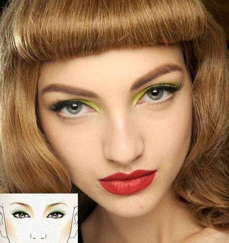 將墨綠色眼影以煙熏的方式暈染整個眼窩,或點綴在眉頭下方與兩眼角