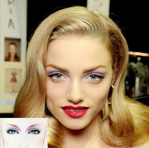 清澈的藍綠色與迷人的紫色搭配能夠表現出女性的魅力與清純。配合透明唇彩,華麗而不失簡潔。