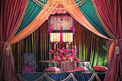 考究的新人,還會搞點真家伙。比如,有新人喜歡那種東北風(fēng)格的土炕,于是索性在婚禮上做出一個搬到舞臺上,主桌的人必須脫鞋上炕,才能吃到酒菜。不過,這可得花上點代價,因為宮燈、景泰藍鐲子這樣的東西都是古玩市場可以淘來的,但土炕卻要純?nèi)斯ぶ谱鳎€有人喜歡亭臺樓閣,會制作出有飛檐的雕龍畫鳳的樓宇,單是兩根紅木大柱子價格就貴得嚇死人。制作這樣婚禮的新人婚宴的排場通常都很大,他們需要在大場地上做出吸引眼球的獨特布置