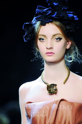 Lanvin秋冬秀場(chǎng)有春天足跡,柳垂,風(fēng)來,花開,蝶舞,模特Codie Young纏繞于頸間的金色花朵項(xiàng)鏈,將裸色露肩小禮服的素淡化為耀眼。