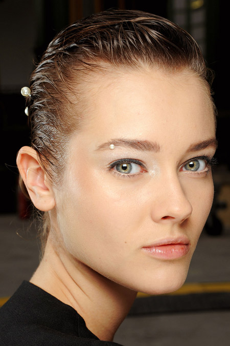 ??? 香奈兒 (Chanel) 2012春夏巴黎時裝周秀場上,彩妝師Peter Philips 把妝容重點放在光澤上,體現出唯美純凈和淡淡的奢華,與裝點的施華洛世奇半圓形珍珠相映生輝。他用白皙又有光澤的底妝配上了粉色珊瑚色的腮紅,濕潤并微閃光澤的眼影,最后以黑色的眼線收尾。嘴唇上也帶著微微的珠光,最亮的只有粉色唇彩和被貼在模特的眉毛、耳朵和鼻側,或者濕潤的頭發上的白色珍珠。