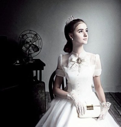 露肩的設(shè)計(jì),很能修飾肩部的曲線,并讓其展露無遺。性感的鎖骨讓你嫵媚感表現(xiàn)得淋漓盡致。腰間緊身的設(shè)計(jì),非常收腰,背后的大蝴蝶結(jié),可愛女人的幸福昭告天下。 復(fù)古的婚紗,有著難以言喻的美感。小豎領(lǐng)和特別的肩部設(shè)計(jì),充滿了淑女的美感。胸前金屬扣上的蝴蝶結(jié),端莊又美麗。婚禮的神圣感體現(xiàn)在蕾絲手套和珍珠耳環(huán)還有水晶皇冠上哦