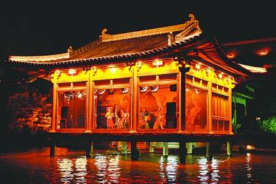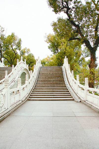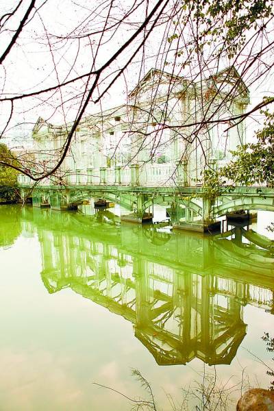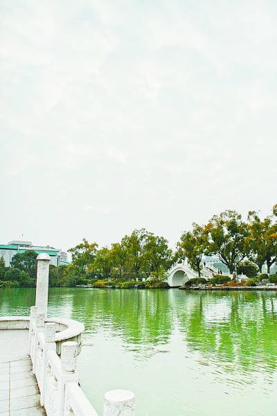 榕湖上有很多橋,對著古南門的是一座仿頤和園玉帶橋的古榕雙橋。雖說是仿古,卻與景色相宜,很是自然。拾級而上,從榕樹中望去,是曲折的類同北斗七星的七星橋。再向前看去,玻璃橋影影綽綽。玻璃做的橋總是引人好奇,在郁綠湖水的映襯下,顯得頗為晶瑩透明。近看去,橋身小巧,在橋上來回走一遭,還真有些童話世界的趣意。