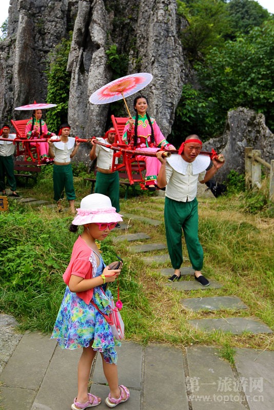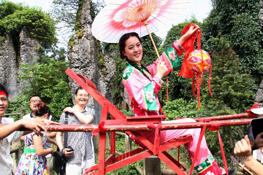 ????入夏以來,不少游客涌向四川省華鎣山,一邊休閑納涼,一邊欣賞當地群眾展演的民俗文化活動“滑竿抬幺妹”。“滑竿抬幺妹”,已成為華鎣山一道靚麗的風景。“滑竿抬幺妹”是華鎣山區以紅巖鄉為主的傳統習俗。古代華鎣人以人行石板路為主,交錯縱橫,崎嶇蜿蜒。自唐代開始,以人力為支撐的滑竿因其簡單、經濟適用應運而生,并得到廣泛使用。滑竿由兩根韌性強、長3米左右、粗5厘米大小的斑竹,配以涼椅(或躺椅、坐椅)一把,捆扎而成。“幺妹”是農耕文明背景下對農家小妹的稱謂。表演時,轎夫一前一后,幺妹坐于椅中,自撐傘擋陰,輕顛慢顫自在行走。其表演程序通過上滑竿、起滑竿、顛試滑竿,各種路途狀況號子呼應提示、途中風趣逗樂以及下滑竿等環節的細化,形成完整的行為范式和文化情趣。