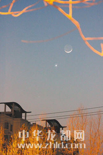 1月22日晚,“金星合月”在周口市區上演。彎月如同一艘銀色小船,明亮的金星在月亮左下方的天區跟隨著它。晚報記者 金月全 攝