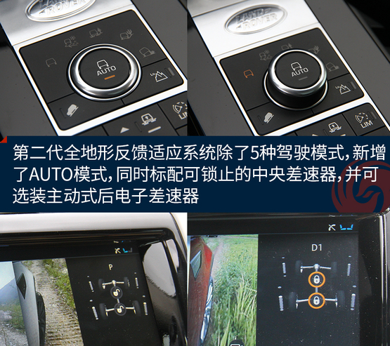 這套第二代全地形反饋適應系統,提供五種駕駛模式:普通駕駛模式、雪地模式、泥地模式、沙地模式以及攀巖模式。這些放在全新一代發現上似乎不值一提,不過第二代系統加入了AUTO模式,可自動監測行車狀況。同時,第二代系統標配可鎖止的中央差速器,并可選裝主動式后電子差速器。