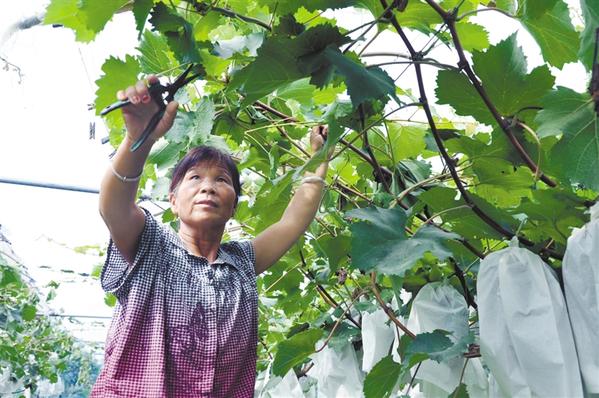8月3日,一村婦在河南省商水縣天力葡萄種植農民專業合作社為葡萄剪枝打杈。
