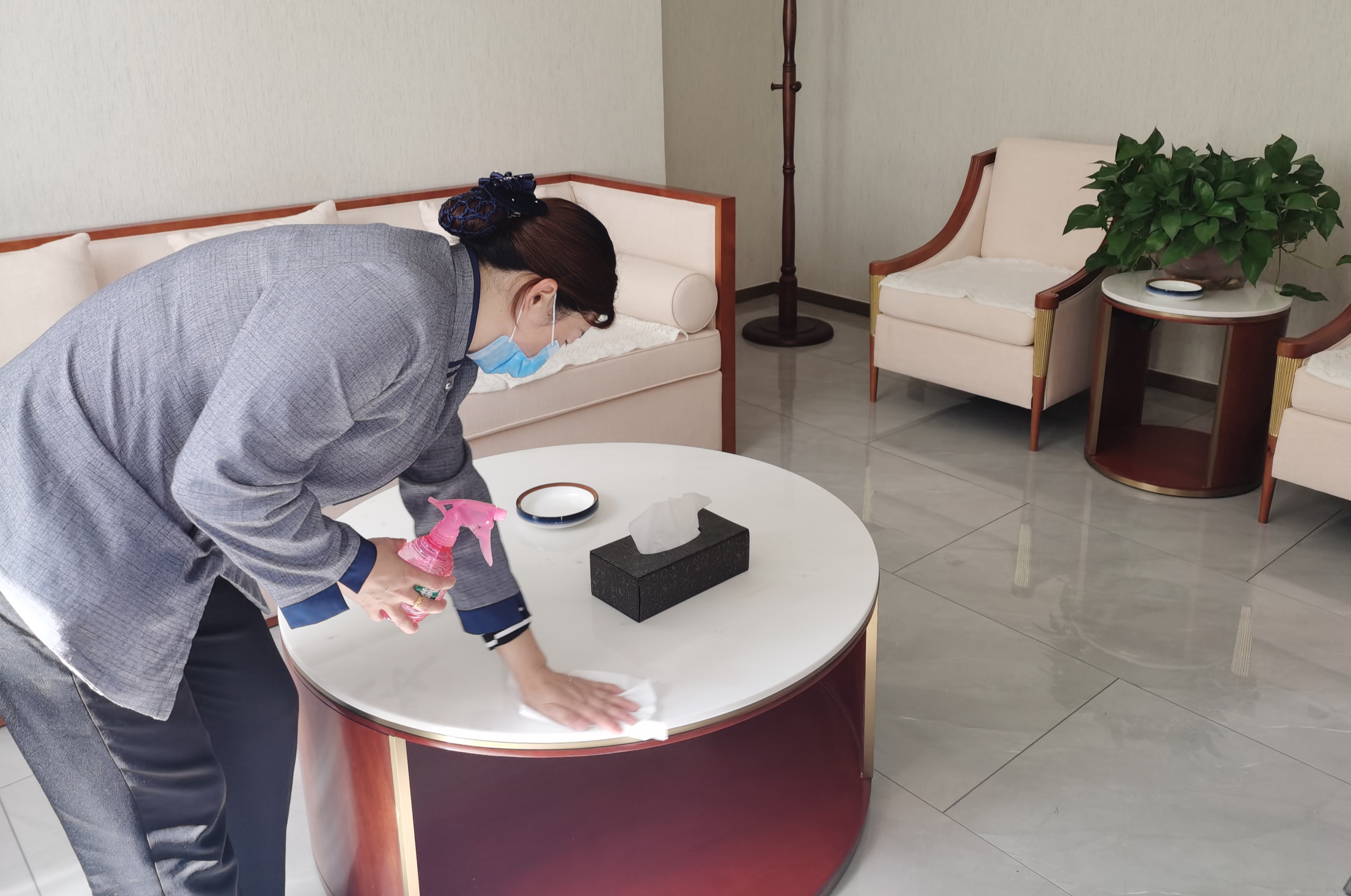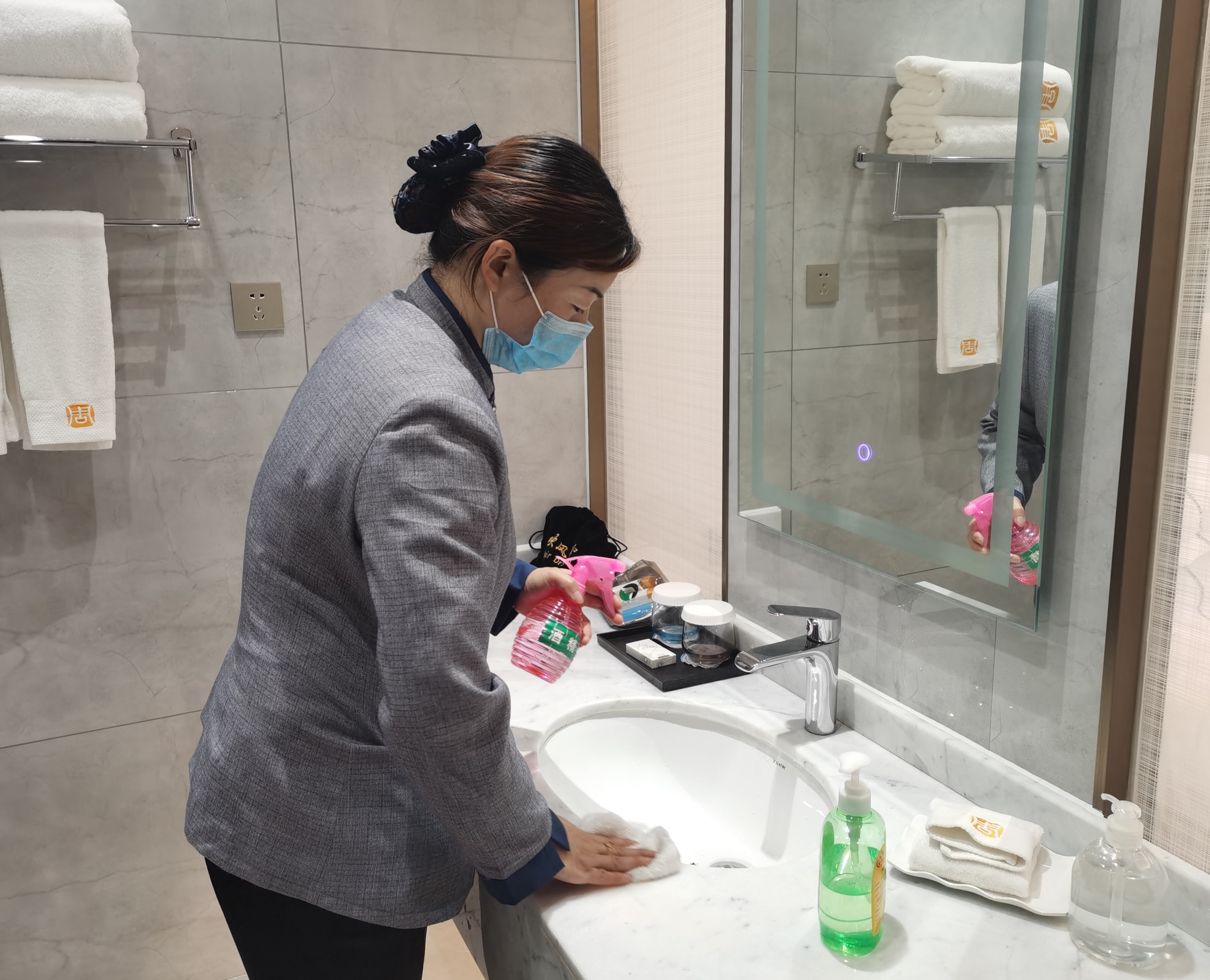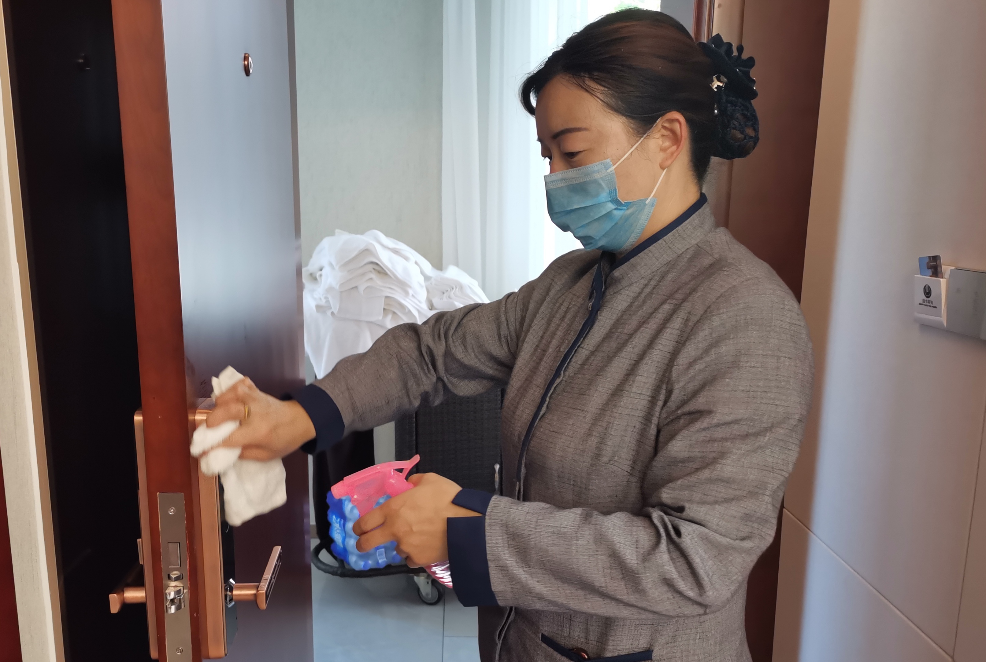 5月10日,記者在“兩會”駐地酒店看到,酒店工作人員不時對客房和公共場所、會議室進行消毒、擦拭。受疫情影響,“兩會”駐地酒店工作人員認真和精心準備,加強了對代表、委員駐地消殺防疫,還貼心地放置了一次性電梯按鍵專用紙、酒精等物品。