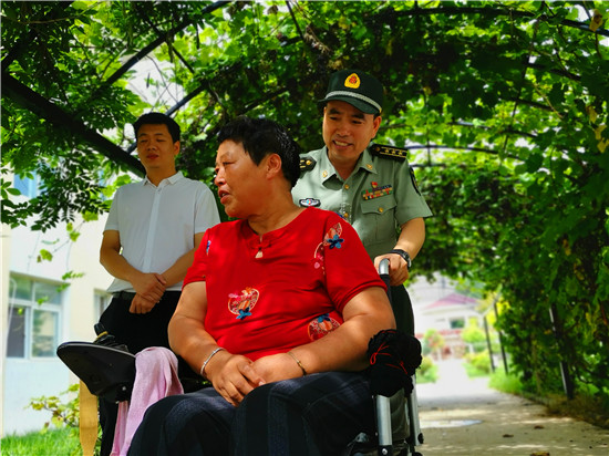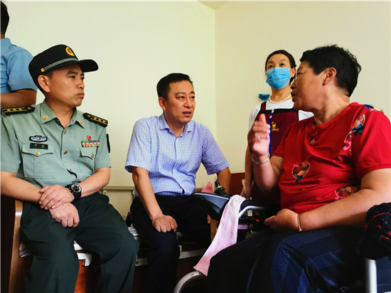 走進位于太昊路上的周口市老年護理院,院內整潔有序、花蕊吐香鳥鳴聲聲,小徑通幽處的涼亭內三五老人打牌、聊天,一副愜意安詳的生活場景。在侯國領母親王玉勤居住的房間內,李揚、孫光濤等人坐在床邊與她聊天談心,看到這么多人來慰問她,王玉勤眼中流下了感動的眼淚,她對慰問人員表示感謝,說自己來護理院近一年來,吃住條件都不錯,護理院照顧的無微不至,身體一天天恢復,閑暇時還能不依賴輪椅自己走上一段路。她激動地說:“感謝黨和政府的親切關懷,我最大的愿望是希望倆兒子永遠聽黨的話,在部隊安心服役、再立新功,用優(yōu)異的成績回報黨和政府對我們全家的關愛。”