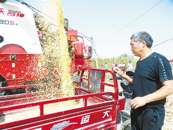 昨日上午,沈丘縣石槽集鄉涂樓村一訂單優質玉米生產基地內,村民正忙著機收玉米。連日來,該縣農民滿懷豐收的喜悅,利用晴好天氣抓緊搶收玉米,力保秋糧顆粒歸倉。