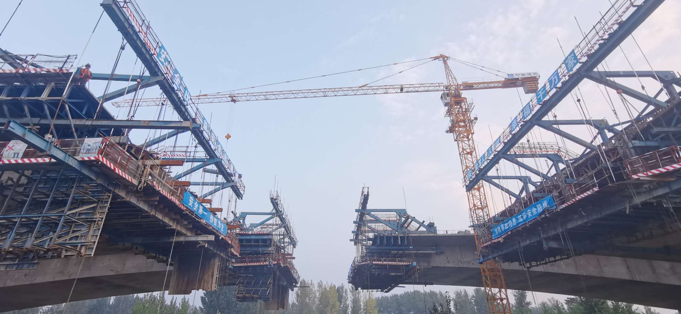 該橋東西兩側引橋采用40米預應力箱梁,全橋40米預制箱梁252片,東側引橋梁板架設已全部完成正在進行橋面系施工,西側引橋已架設半幅。主橋采用預應力變截面連續現澆梁,懸澆段共16個節段,采用四套菱形掛籃;左幅已施工至15號節段,即將開始合龍段施工;右幅已施工至12號節段。