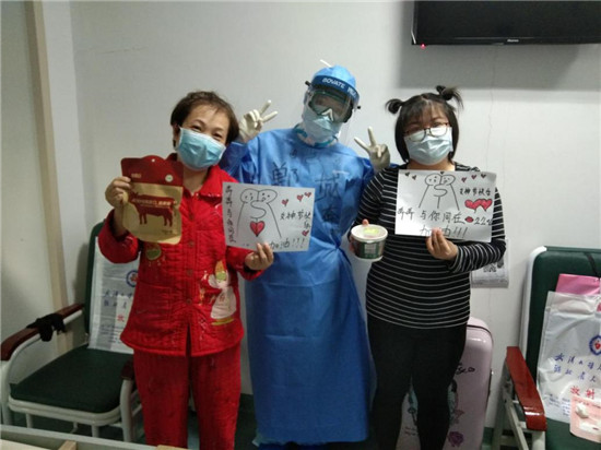 面對新冠肺炎重癥病區患者心理壓力普遍較大的情況,胡奔奔每天忙完護理工作之余,主動通過談心、跳舞、做游戲等方式對患者進行心理疏導,成為大家的“開心果”,使得病區氛圍大大改善,有了歡聲笑語。三八節當天,她為病區患者送上親手繪制的“奔奔與你同在”簡筆畫,以及家鄉特產牛肉和胡辣湯,為患者加油。見到患者的笑容,成了胡奔奔最開心的事情。