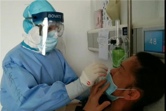 這位老人名叫楊守振,今年84歲,不僅感染新冠肺炎,而且有嚴重的營養不良,插著胃管,身體極為消瘦,生活不能自理。為了不讓老人出現壓瘡,胡奔奔需要每隔一個小時為老人翻一次身。翻身時候,為了讓老人更舒服一點,她每次都像抱孩子一樣把老人抱在懷里,動作輕柔的按摩老人受壓的部位防止壓瘡的形成。貼心照顧之下,老人身體狀況和精神逐漸好轉,每次跟家人視頻聊天的時候,老人都會指著幫她舉著手機的胡奔奔朝手機里的家人顫顫巍巍的豎起大拇指。