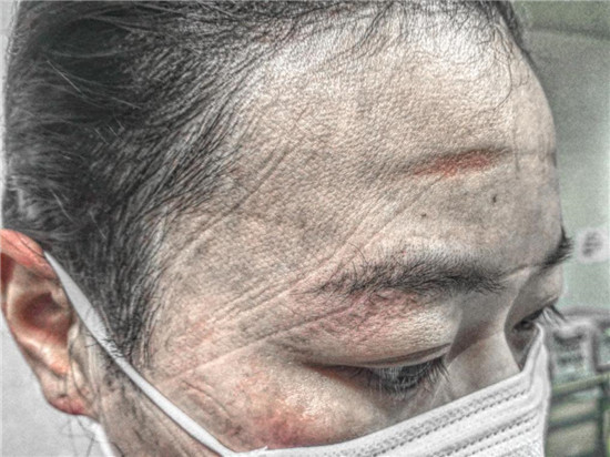 因為新冠肺炎的強傳染性,胡奔奔每次去病區上班都要全副武裝,而且為保證在6個小時的工作時間內不被暴露,不能去衛生間,不能喝水,還要穿上成人紙尿褲以防萬一。這樣下來,汗濕衣服是常事,而且下班后脫掉防護裝備后,她原本清秀白皙的臉上,滿是深深的皺褶,久久難以恢復,惹人心疼。給家人報平安時,胡奔奔甚至不敢視頻聊天,只能語音安慰家人。