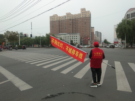 10月12日,記者在周口中心城區交通大道與建安路交叉口看到,幾名志愿者手中的小紅旗“加長了”,上面還寫有“不闖紅燈,不越停車線”的溫馨提示語。路過此處,不少市民把目光投在了這個加長的小紅旗上,有的還輕聲讀出紅旗上的標語。通過這些溫馨提示語,讓市民在潛移默化中逐漸增強文明出行的意識。記者 張洪濤 攝 ②5