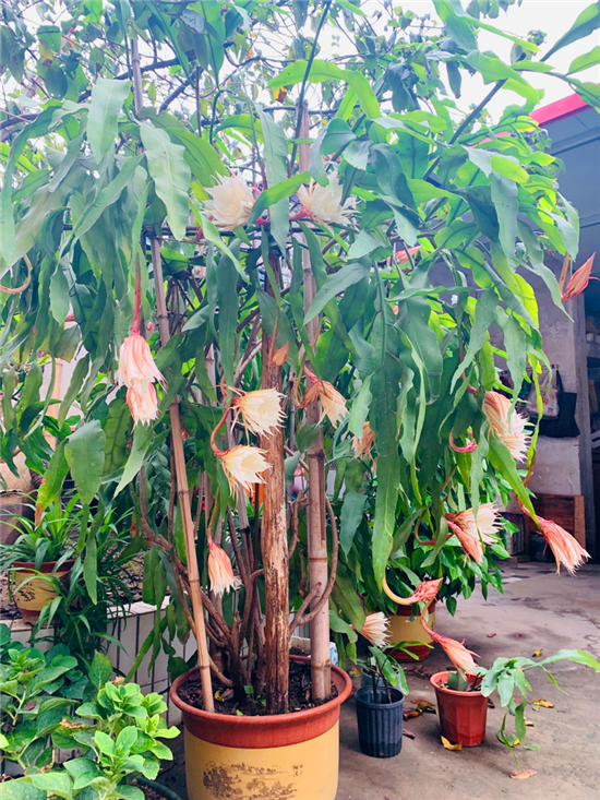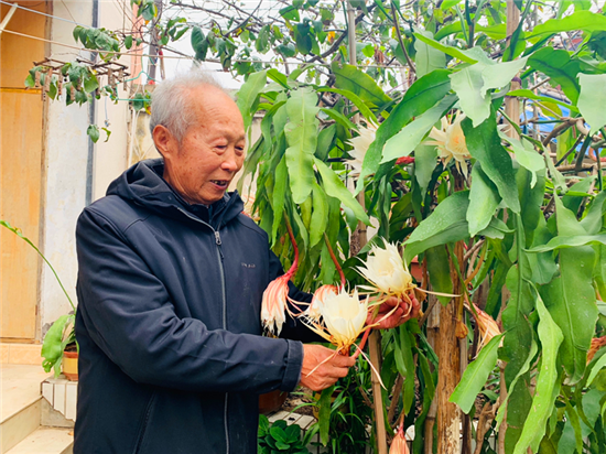 在周口市中心城區(qū)的一個家屬院里,記者見到了88歲的苗天才和他養(yǎng)的曇花,“一株21年樹齡的曇花開了43朵,另外兩株5年樹齡的曇花加起來開了13朵,這3株曇花一共開了56朵。”苗天才說,早上四五點的時候曇花就慢慢地開放了,到現在五六個小時過去了曇花還保持著開放狀態(tài)。