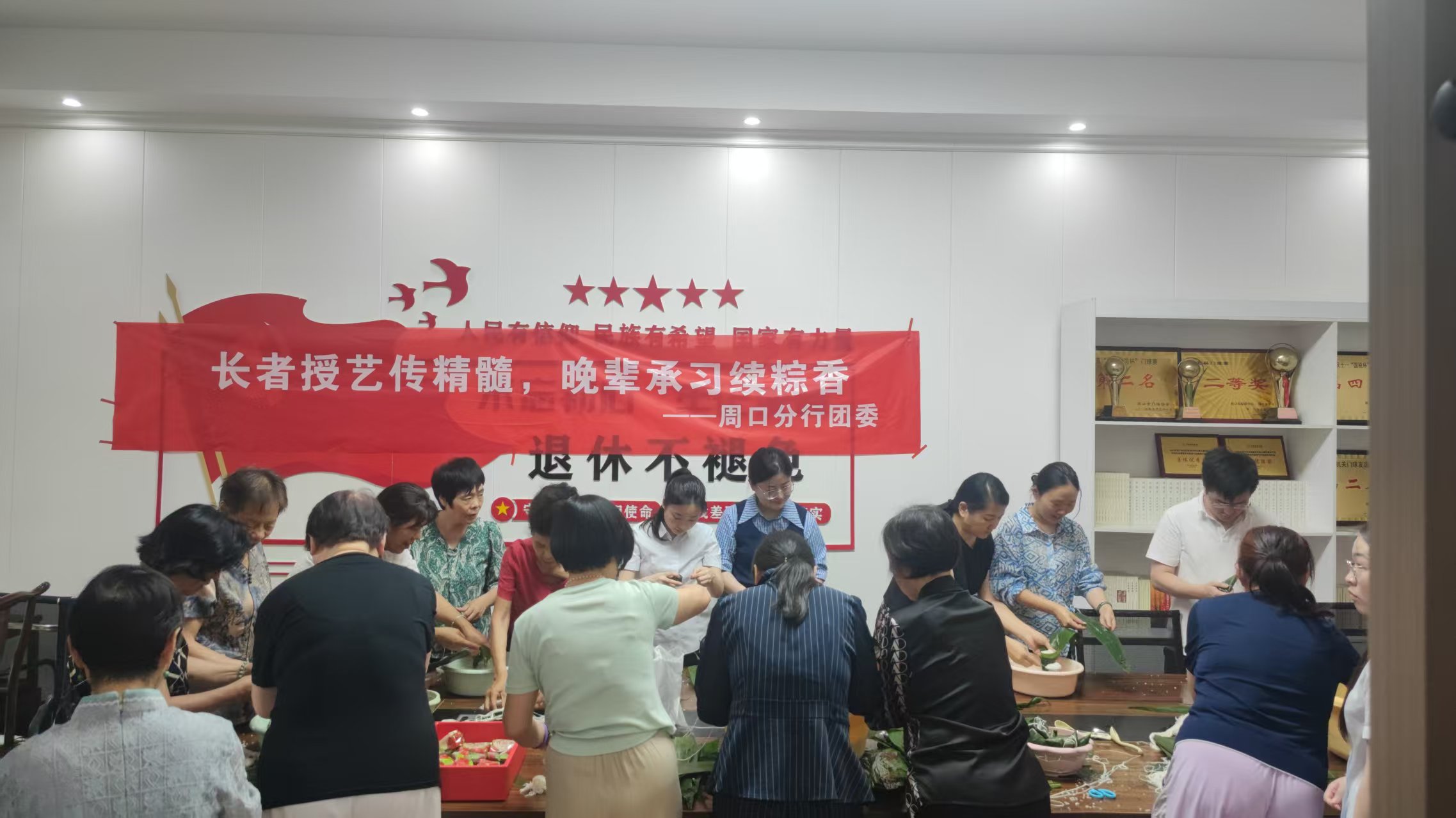 活動現場,該行離退休老黨員、老員工們化身“技藝導師”展示自己包粽子的手藝,耐心細致地向青年員工傳授包粽子的技巧。從粽葉的挑選、整理、折疊,到糯米、大棗的裝填、捆綁,長輩們手把手的教,青年們認真操作,在老員工的悉心指導下,一個個形態各異的粽子逐一成型。期間,大家聊工作聊生活,老員工分享以往工作和日常生活經驗,青年員工認真領悟,虛心請教,現場充斥著和諧安康的傳統節日氛圍。