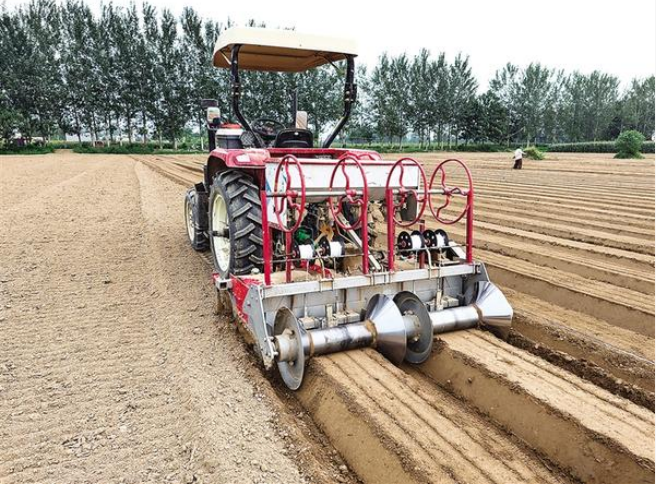 ?9月4日,在淮陽區臨蔡鎮吳金鋒家庭農場種植基地,一臺集旋耕、施肥、起壟、播種于一體的北斗導航農業機械正在播種蘿卜。