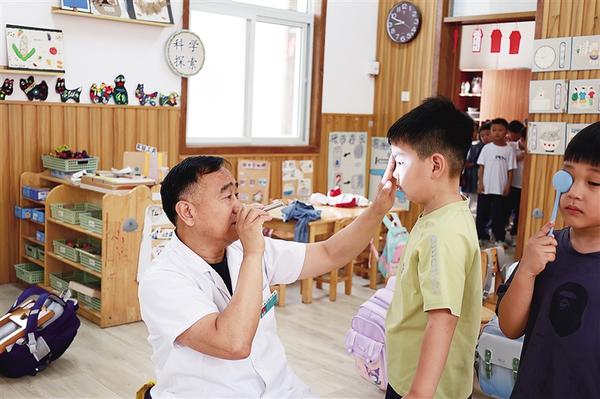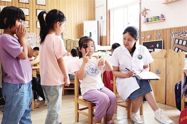 5月19日,扶溝縣中醫院眼科的醫護人員在扶溝縣直幼兒園為小朋友檢查視力。近日,為迎接即將到來的第30個全國“愛眼日”,扶溝縣多家幼兒園開展“愛眼護眼從小做起”主題活動,邀請醫務人員到校講解眼科知識和用眼衛生常識,并為小朋友進行視力檢查,引導其養成正確用眼習慣。