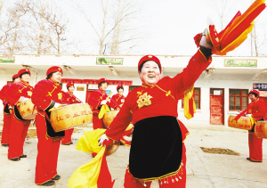 ④扶溝縣江村鎮(zhèn)江南盤鼓隊正在村室緊張排演節(jié)目。春節(jié)期間,她們走上街頭,為當(dāng)?shù)厝罕娝蜕衔幕蟛汀?nbsp; (記者 王 映 攝)