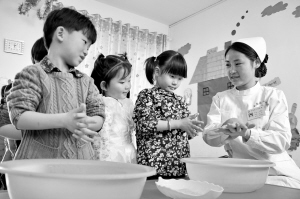 4月7日,醫務人員在為河北成安縣七色光幼兒園的小朋友講解正確的洗手方式。當日是世界衛生日,河北省成安縣人民醫院組織醫務人員來到轄區幼兒園,為小朋友們講解如何正確洗手、刷牙等衛生知識,讓他們認識到講衛生的重要性,養成良好的衛生習慣。新華社發