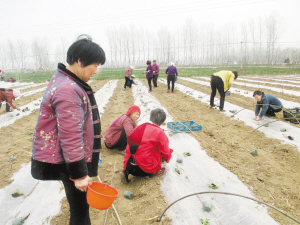 周營鄉積極調整種植結構,因地制宜發展高效農業種植,引導群眾搞小弓棚西瓜種植,畝均收入6000余元。4月2日,該鄉王寨村農民正移栽西瓜苗。