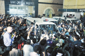 孟加拉國反對黨領導人被執行死刑 4月11日,在孟加拉國首都達卡,人們圍住運送卡馬魯扎曼尸體的救護車。當晚,孟加拉國反對黨伊斯蘭大會黨領導人卡馬魯扎曼在首都達卡中央監獄被執行死刑。新華社發