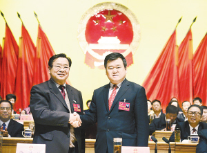 右圖 新當選的市人大常委會主任徐光與李洪民親切握手。(記者 沈湛 攝)