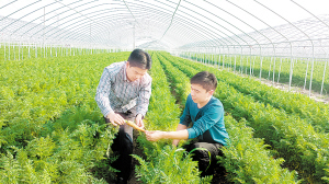 在扶溝縣汴崗鎮越秀蔬菜種植園區,技術人員正在查看胡蘿卜長勢。該鎮大力推進種植業結構調整,流轉1300多畝耕地,建成了全國最大面積的單片反季節胡蘿卜種植基地,預計每畝產值可達萬元。(記者 王泉林 攝)