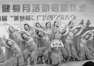 5月10日上午,扶溝縣一女子代表隊(duì)在臺(tái)上表演舞蹈。當(dāng)日,扶溝縣2015年健身月啟動(dòng)儀式暨廣場舞交流大會(huì)拉開帷幕。來自全縣各鄉(xiāng)鎮(zhèn)巾幗代表隊(duì)依次走上舞臺(tái),展現(xiàn)其優(yōu)美的舞姿。在接下來的一個(gè)月里,該縣還將聯(lián)合各類體育協(xié)會(huì)在城區(qū)開展武術(shù)、跆拳道等體育活動(dòng)。盧付昌 申蘭霞 攝