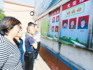 上圖 昨日上午,商水縣巴村鎮上城村村民正在圍觀“好媳婦”、“好婆婆”、“好孝子”光榮榜。據了解,被評為“全國文明村”、“河南省生態文明村”的上城村,已連續3年開展“好媳婦”、“好婆婆”、“好孝子”評選活動。(喬連軍 攝)