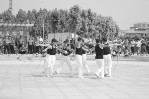 為進一步推動全民健身活動的深入開展,項城市啟動了“全民健身月”活動,讓市民積極投身到全民健身行列中,努力使體育鍛煉經常化、個人健身生活化。圖為5月18日項城市鞭陀協會的會員正在進行鞭陀健身展演。