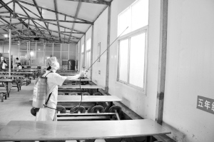 當日下午4時許,在該校食堂內,記者看到,消殺人員正在噴灑滅蚊蠅的藥物。墻壁、天花板、地面、餐桌……食堂的每個角落都被他們仔細地噴灑了一遍。