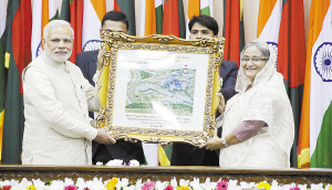 印度和孟加拉國簽署多項文件加強合作 6月6日,在孟加拉國達卡舉行的新聞發布會上,孟加拉國總理哈西娜(右)向印度總理莫迪贈送電站項目效果圖。孟加拉國總理哈西娜6日與正在孟加拉國訪問的印度總理莫迪舉行會談,兩國當天簽署多項文件加強合作。新華社發