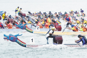 6月14日,選手們在比賽中。6月13日,馬來西亞沙巴州首府哥打基納巴盧舉行第二屆沙華堂國際龍舟賽,迎接即將到來的中華民族傳統節日——端午節。