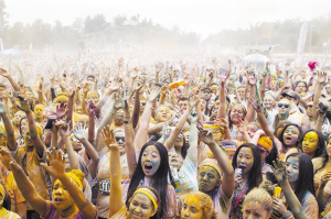 6月13日,在美國洛杉磯,跑步愛好者在“彩色跑”活動中。當日,約萬名跑步愛好者在洛杉磯道奇球場外參加“彩色跑”活動。新華社發