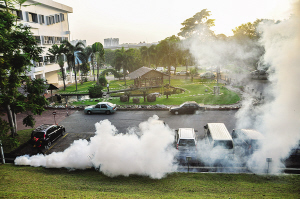 6月22日,在馬來西亞雪蘭莪州加影的一所學校,一名工作人員在噴滅蚊煙霧。根據(jù)馬來西亞衛(wèi)生部當日的資料,今年1月至6月11日間,馬來西亞共有50873例登革熱病例,其中144名死亡,死亡率比去年同期增加百分之百。