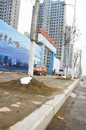 在文昌大道市文化藝術(shù)中心門前,路中間的綠化帶將快車道一分為二,全線綠化帶建得比較高,且土層遠遠高出邊石,看過去像一座座鼓起的“小山包”,人坐在轎車內(nèi),只能勉強看到對面轎車的車頂。繼續(xù)向東,綠化帶變得荒蕪一片,草皮枯萎,加之附近居民經(jīng)常走動,被踩出了一條條小路,大片黃土裸露,積雪融化后,道牙邊幾乎都是泥。這里的情況更是常被環(huán)衛(wèi)人“吐槽”,塵土多,路面顯得很臟,拖了區(qū)域內(nèi)整體環(huán)境衛(wèi)生的“后腿”。